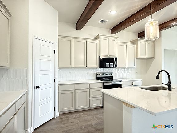 Discover refined living in this stunning Tippit built home situated in sought-after Three Creeks subdivision located close to Stillhouse Hollow Lake Dam, equidistant to the Temple/Belton or the Harker Heights/Killeen/Fort Hood areas. This 3 bedrooms, 2 baths home, on a cul-de-sac lot bordering on an eye-pleasing greenspace, presents 1,885 square feet of open-concept living. As you enter through the inviting entryway you are greeted by an expansive living area with raised, beam enhanced ceiling, flowing seamlessly into the chef-inspired kitchen featuring a central island with bar seating for casual meals, a walk-in pantry, and an adjacent dining space overlooking the verdant backyard and treetops beyond. Additional highlights include a split floorplan with a private primary suite, complete with a nicely appointed bath, tucked away at the back of the home, and secondary bedrooms and a full bath near the front of the home. A welcomed mud room links from the 2 car garage to the primary bedroom closet as well as the entry hallway. Outdoors, unwind on the covered patio enjoying the view of the greenery. Community amenities include bike and/or walking trails galore with plenty of benches for rest and relaxation, and/or enjoyment of the beautiful views, &and a community pavilion perfect for family and/or community get- togethers. Another welcomed perk: this area is part of the Belton Independent School District!