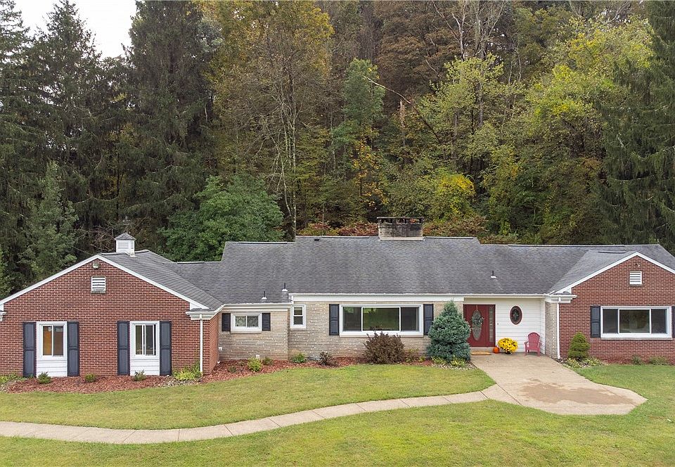 ''Fall in love'' with this updated, Sprawling Brick Level entry Ranch situated on 4.4 acres in Franklin Regional SD! Open-concept layout with hardwood floors, large picture windows, and a stunning kitchen featuring KraftMaid cherry cabinetry, granite counters, slate backsplash, stainless appliances, and a 10-ft island. 3 spacious bedrooms, 3.5 full baths, including a renovated primary suite with custom walk-in closet and spa-style shower. Enjoy the dual-sided fireplace between living/family rooms with Mahogany/marble/porcelain tile mantels. Very versatile space with so many options depending on your lifestyle plus a 4-season sunroom leading to the fenced backyard. Finished lower level offers a game room, full bath, office/den, wood fireplace, and tons of storage. Geothermal HVAC, central vac, newer H2O tanks, some Energy Swing windows, public sewage in 2020, 200 amp electric, and a 2-car garage. Garden, shed, and custom chicken coop complete this cozy, modern friendly home!