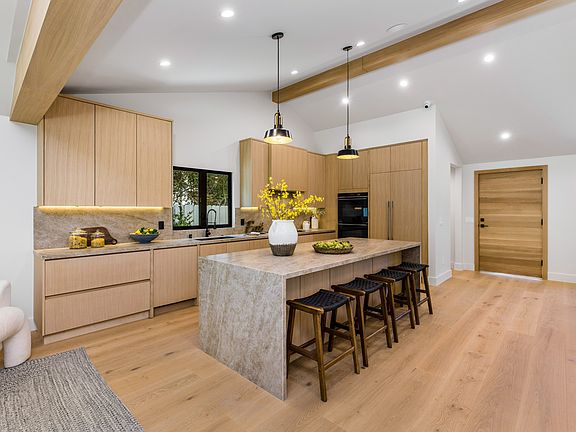 Situated on a tranquil street in the heart of Sherman Oaks, this stunning single-level residence has been thoughtfully reimagined with refined style and understated elegance. Featuring four bedrooms and three and a half bathrooms, the home showcases a generous open layout designed for both effortless living and elevated entertaining. At its center, a gourmet kitchen impresses with Fisher & Paykel appliances, sleek light-toned cabinetry, and an oversized island with bar seating, ideal for casual gatherings or everyday meals. The kitchen flows seamlessly into the living and dining areas, where a modern electric fireplace and pocket glass doors create a sophisticated connection to the backyard oasis. Down the main hallway are three bedrooms, including a serene primary suite featuring dual walk-in closets, direct access to the backyard, and a spa-like ensuite bath with a floating double vanity and expansive step-in shower with a built-in bench. A final bedroom is tucked away in the opposite wing of the home, featuring its own en-suite bath with a stone-topped vanity and luxurious step-in shower. A thoughtfully designed laundry area off of the bedroom completes the space with a deep sink, generous counter space, and additional storage. Designed for year-round enjoyment, the lush backyard embodies the best of California living with a built-in BBQ, sleek fire pit, and ample seating for gatherings under the stars. Ideally located moments from Westfield Fashion Square and the shops and restaurants of Ventura Boulevard, this turnkey home blends contemporary luxury with everyday convenience.