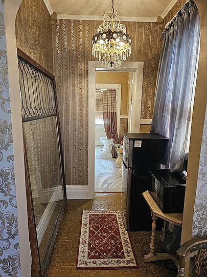 The Blue Room is the perfect mid-term rental for the traveling professional in Decatur, Illinois looking for at least a 30-day minimum stay. This 2-room suite is located on the second floor of an 1898 furnished Queen Anne Victorian home in the heart of Decatur's historic district. It comes completely furnished with a King bed, mini fridge, microwave, internet, bathroom and glam closet. It has a coded entry knob for the suite itself and the home has a security alarm system as well as cameras. The house has 2 other suites in it and you would be paying primarily for the suite itself. However, the washer and the dryer are free for you to use, and they are located on the main floor. Parking is free out front on the street. This is a quiet home, and it has been renovated to hold its historic charm with modern amenities including insulation for comfort of those cold nights. The Blue Room has its own temperature control. All you need is your personal effects, everything else is provided.