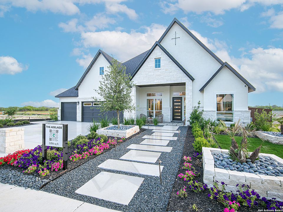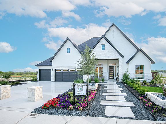Conveniently located 5 mins from Hwy IH35 to get you to and from shopping and city items. This will also keep you far enough from the business of that city life where you will hear the wind and the birds with tranquility you've always dreamed of. The Adelaide is a dream home layout showcasing 8 ft doors throughout, and double kitchen islands, with 11-14ft ceilings throughout. The Primary Bathroom is definitely a Suite to be desired with a statement piece closet, oversized walk-in shower, and separate standalone soaking tub. This beautiful corner lot is situated next to oversized trees and walking trails to be sure you can take casual walks in the evenings.