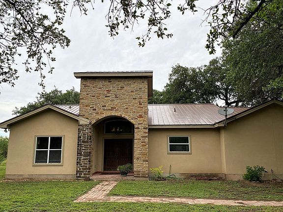 Country living but just minutes from town, shopping and Hospital. Just under 5 acres with abundant, mature oak trees for shade. Picture perfect setting with plenty of room out back for a pool. Custom built home offers a large master suite with stunning master bathroom and huge walk in closet. Custom tile throughout. Open concept living - dining - kitchen area with room to entertain the whole family. All appliances convey, even washer and dryer! Gorgeous wood burning fireplace in the living room. Across the common area there are two guest bedrooms and a guest bath with the same high end finishes as the rest of the home. New metal roof just installed about a year ago. Owner is in the process of installing a pipe fence up front. One year home warranty included for piece of mind! Call listing agent, Gene Evans at 830-486-9682 to schedule a showing.