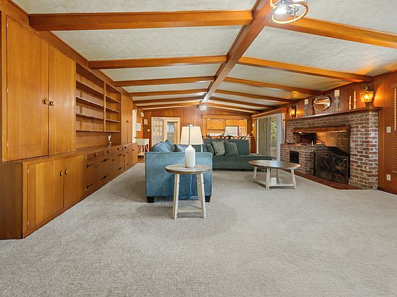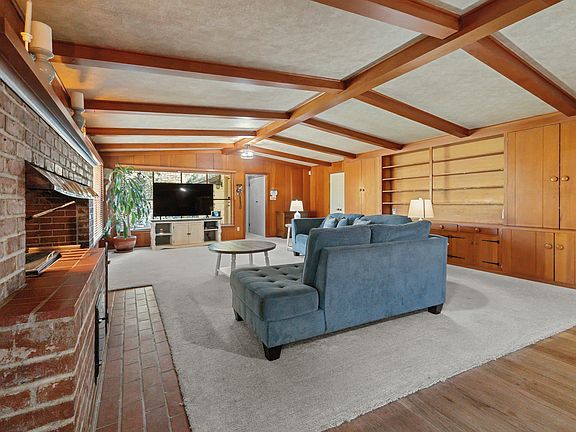 Open-beam family roomHardwood floorsGalley kitchen