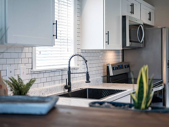 Ample storageElegant crown moldingIn-home washer and dryerNew vinyl floorsStainless steel appliancesTile backsplashSoft-close cabinets