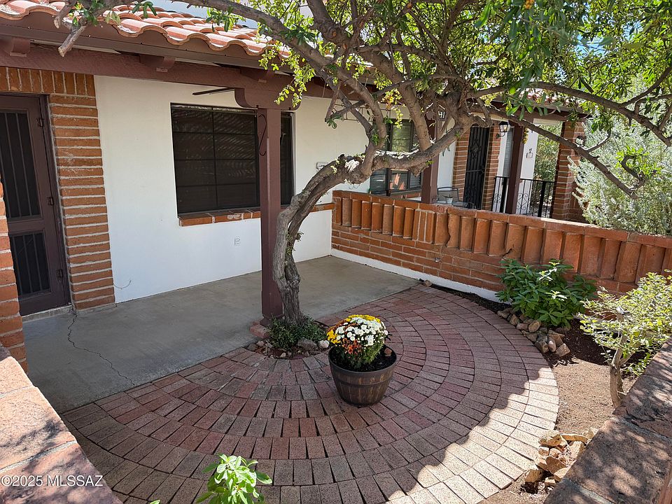 West-facing corner unit under large shade trees allows gorgeous sunset viewing surrounded by lush desert greenery. Enjoy not having to maintain or operate an outside washer/dryer closet, since you can utilize any of three laundry buildings with attached outdoor clothesline courtyards - put in a load or two, then relax at one of the two swimming pools!Interior is super clean and freshly painted in modern neutral tones to compliment the smooth tile flooring, while bedroom offers a plush carpet underfoot.Original floorplan means abundant kitchen storage with shelving hidden behind folding doors. Choose to shower or bathe in the cast iron tub, or reconfigure to suit your own needs.Ideally situated and value-priced, this charming villa maintained by HOA supplied water, HVAC, water heater, twice weekly garbage pickup, service for pest control, dedicated lighted parking and manicured landscaping.