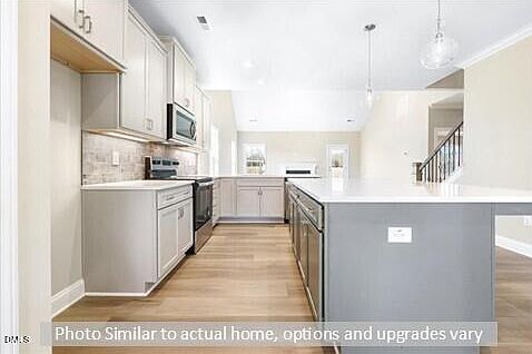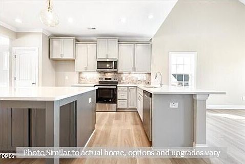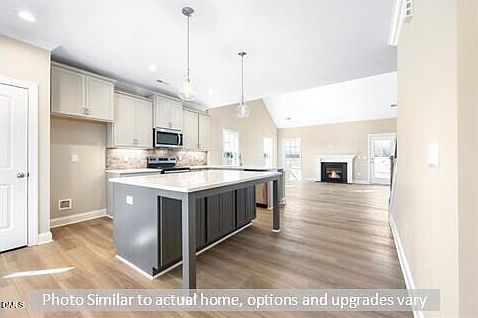 Your New Windsor Home by Stanley Martin Awaits! Welcome to The Richmond—a thoughtfully designed floor plan offering 4 bedrooms, including a main-level primary suite, 2.5 baths, and more than 2,500 sq. ft. of open living space. The chef-inspired kitchen is the heart of the home, featuring 42'' cabinetry, Valor White quartz countertops, a tile backsplash, stainless-steel appliances, and a central island perfect for gathering. Enjoy multiple dining options with island seating, an extended bar open to the great room, and a formal dining room accented by a coffered ceiling. Relax in the spacious primary suite with a tray ceiling, double vanity, tiled shower, and walk-in closet. The vaulted great room includes a gas log fireplace and a loft overlook for added architectural interest. Hardwood stairs lead to the second floor, where you'll find a versatile loft, three additional bedrooms, and a full bath with a double vanity and private tub/shower area. Located on a quiet cul-de-sac on Valentine Court, this home offers a private wooded backyard view from the patio. Valor Ridge features community sidewalks and streetlights, perfect for evening strolls. Enjoy nearby recreation at South Graham Park (1 mile) or Cedar Rock Park (15 minutes). Commuting is easy with I-85/40 just 2 miles away, providing quick access to RTP and the Triad. The Richmond is nearing completion—schedule your tour today!