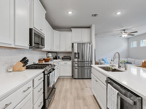 Built by Taylor Morrison in Ideal Location - Near Vibrant and Growing Mueller Area and Downtown. This Mozart model has master bedroom and office in main, has many model home upgrades including hardwood floors in main level. The kitchen is perfect for the chef with stainless steel appliances, gas range, microwave and center island with a rectangular undermount sink. The kitchen opens to the great room and dining area with abundant natural light. The downstairs primary bedroom suite provides a double vanity, walk in shower and walk in closet. You will find a game room upstairs for another living area. The two secondary bedrooms are upstairs with a separate full bathroom. Refrigerator, washer and dryer are included. The two car garage opens to the backside of the home. Also, you have a covered patio on the backside to relax and/or entertain. Both side neighbors having ranch houses, which gives second level windows great lighting. Additional parking is available with 16 guest parking spots. The community amenities include a community Pool with Gas Grills; Dog Park; Hammock Grove. Easy access to the top dining, farmer's markets, outdoor activities, live music and shopping the area has to offer. Lease for one year. Dogs under 30 pounds are allowed with pet deposit. Tenant will be responsible for utilities and yard maintenance. Lease for one year. Dogs under 30 pounds are allowed with pet deposit. Tenant will be responsible for utilities and yard maintenance.