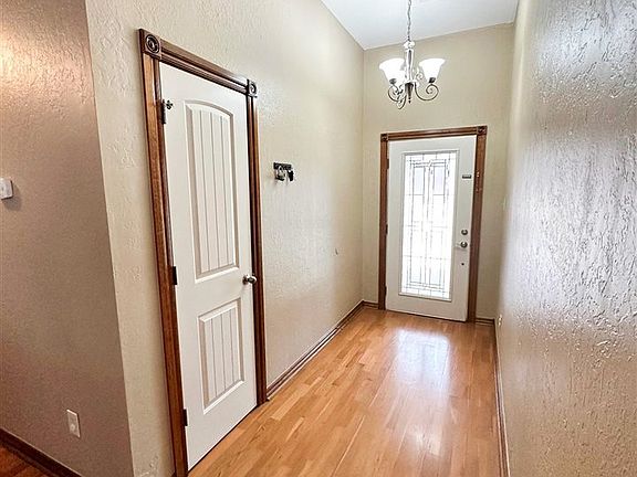 Beautiful home in Dove Creek Addition. Includes 4 bedrooms with 2 full baths and 2 car garage. Nice open floor plan with spacious living space and kitchen with breakfast bar. Upgraded stainless steel appliances. Hardwood floors in living and hallways. Primary suite with walk-in closet, whirlpool tub and separate shower. Over 2000 Sq. Ft. Great backyard with new cedar fence, extended 20 x 20 patio with stamped concrete and hot tub that stays with the home. Roof was replaced in 2021 with impact resistant shingles. Don't sleep on this one! Call today for a private showing 580-248-8817.