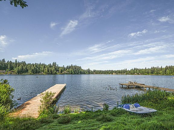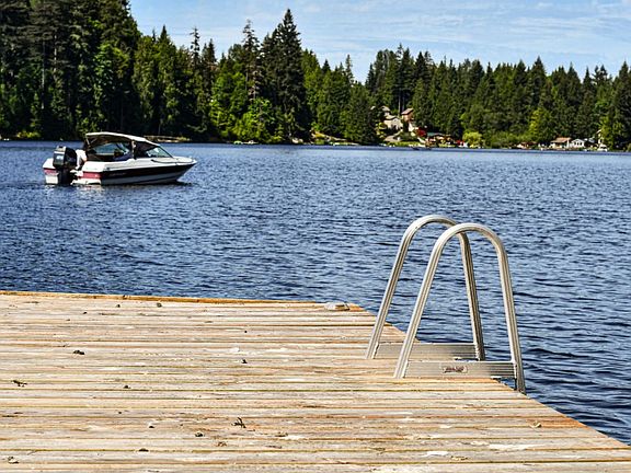 RARE OPPORTUNITY to own a WATERFRONT home with 64 feet of Flowing Lake access. PRIVATE DOCK, motorboats ok. Great 3BR/1BA/1240asf CHARMING COTTAGE on .38 acre lot. Home freshly painted inside and outside, new carpet and Luxury Plank Vinyl (LVP) flooring. Main floor master, dining room, built in cabinets, kitchen w/eat-in space, large living room. Storage shed on hill across the roadway. This is a LIFESTYLE purchase! Sunsets are stunning.