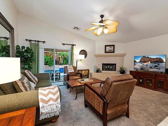 Beautiful 3-bedroom, 2-bath home featuring an inviting open floor plan with a blend of tile and carpet throughout. Enjoy cozy evenings by the fireplace, enhanced comfort with ceiling fans, and seamless indoor-outdoor living. Step outside to your private backyard oasis complete with a sparkling pool, relaxing spa, and a spacious covered patio--perfect for entertaining or unwinding.Ideally located near the world-renowned Santa Carmelita Mountains, this home offers quick access to scenic hiking and biking trails. Just minutes from Old Town La Quinta, you'll enjoy charming boutiques, fine retail shopping, and an array of delicious dining options. A wonderful blend of comfort, convenience, and desert lifestyle living!