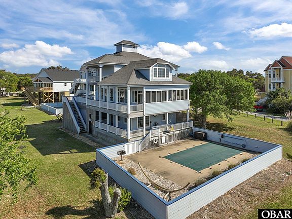 The ground level features a secluded private pool, grilling area, under-house entry, and elevated storage. Head up to the first level to enjoy the game room-- perfect for hosting friends or family. Step outside to canal and pool facing deck or relax by the private pool for an afternoon of sun and serenity. On the second level, you're greeted by stunning canal and sound views from every room. The open-concept living area features hardwood floors, cathedral ceilings, and a gas fireplace. The kitchen is a chef’s delight with stainless steel appliances and ample counter space, ideal for cooking your favorite meals. Enjoy morning coffee or sunset cocktails from the screened porches or covered decks overlooking the sound. Two spacious bedrooms are located off the living room, each with private deck access, and share a full hall bathroom. On the top floor, you will find the primary suite, complete with a jacuzzi tub, dual vanities, walk-in shower, and a private covered porch—your own peaceful escape. Across the hall, a cozy sitting room offers the perfect nook for reading or unwinding.