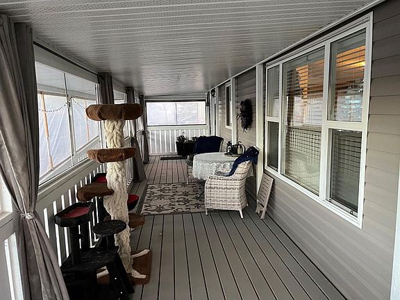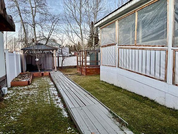 Ideal home with wheel chair access. This 2012 home is 1520 sq ft. 4 bedrooms and 2 full baths, one bathroom is set-up with an easy access walk-in shower. The living room, dining room and kitchen is an open floor plan with 9 ft. vaulted ceilings. The spacious kitchen is equipped with stainless steel appliances and an abundance of cabinetry with the dining area off to the side. The living room is a comfortable area for the family to enjoy. At the one end is 3-bedrooms and a 3-pce. washroom with a walk-in shower. The other end is the primary bedroom with a 4-pce ensuite and walk-in closet. The laundry room is at the back entrance along with the furnace and hot water tank. The 12X40 deck is covered and screened in for a nice 3-season area; with a long wheel chair access ramp which carries on into the back yard to the gazebo. The 2 sheds are included with garden boxes. There is also a thriving apple tree in the yard. This home and yard shows beautifully and is neat as a pin. Water, sewer and garbage are included in the lot rent.