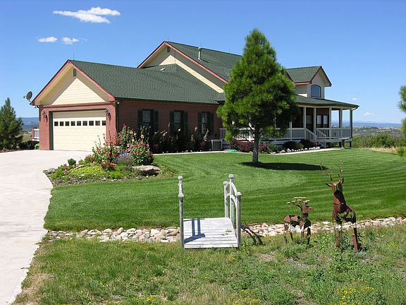 A Truly Remarkable Brick Ranch Located On 36 Acres in A Quiet Gated Community W/Magnificent Views Of The Front Range and Pikes Peak! Features A Full Finished W/O Basement W/Mother-In-Law Quarters Including A Kitchen, 2Nd Master Suite W/Private. Bath, Large Rec and Media Rm, A 3Rd Bdrm W/A Full Bath and Plenty Of Storage Space Too. The Home Is Charmed By Meticulous Landscaping, A Secret Garden, A Beautiful Wrap-Around Deck and Detached Barn/Workshop! Inside Is As Warm and Inviting As The Outside Boasting Brick Flooring, Upgraded Carpet and A Soaring Vaulted Formal Living and Dining Room Full Of Light. It Also Has A Main Floor Office W/Attached Powder Room and A Spacious Family Room W/Cozy Fireside. The Home Has A Gourmet Country Style Kitchen W/Brick Accents,Ss Appliances Including Double Ovens As Well As An Eat-In Nook and Pantry. This Home Has A Grand West-Facing Master Ste W/Sitting Room and Fireplace and A 5-Pc Bath. All Roads Paved To Property!Included-3 Acre Feet Per Year Of Upper Dawson Water Rights!