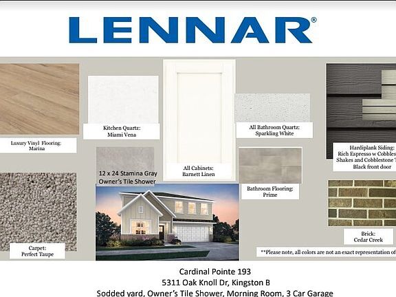 Lennaras premier golf course community, Cardinal Pointe in Whitestown! The Kingston w/ Morning Room,2853 sq ft, 5BR, 3 BA, 3 Car Garage. Featuring Lennaras Everythingas Included w/ upgraded features throughout! Enjoy the Chefas kitchen w/ Stainless Steel appliances including Gas range,& Microwave hood venter to exterior, Dishwasher, Refrigerator, island w/ pull-out trash cans & Quartz countertop, open to dining, 10 x 12 Morning Room,& Great Room. Main floor Guest room, full bath, Upstairs Owners suite w/ oversized Tile shower & private water closet, 3 additional bedrooms, Loft, second floor laundry. Backs to berm. HOA $135/month inc. Spectrum cable & golf club Social Membership. Future Community pool & play park. Ready for May Move-IN!