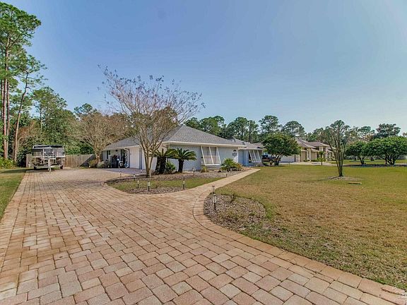 Discover the perfect blend of luxury and coastal charm in this beautifully updated home, just moments from Perdido Key Beach and the renowned Perdido Bay Country Club. Nestled on a generous half-acre lot along sought-after Pale Moon Drive, this meticulously maintained brick residence offers modern features with easy access to NAS Pensacola, downtown, and shopping. Positioned across from breathtaking Perdido Bay, this 3-bedroom, 3-bathroom home provides partial water views in a serene setting. Step into your private backyard oasis, designed for relaxation and entertainment. A new, well-appointed outdoor kitchen with a pergola creates the ultimate gathering space, featuring premium appliances, ample counter space, and elegant finishes. A heated saltwater pool, now equipped with the most efficient heater for rapid warming, invites year-round enjoyment. The fenced backyard also includes a storage shed and an expanded paver patio, complementing the hot tub for a true retreat-like experience. Enjoy the outdoors in comfort from the large screened-in porch, surrounded by well-maintained landscaping and accentuated by outdoor lighting. A spacious three-car garage provides ample storage, and its epoxy-finished flooring adds a sleek, durable touch. Inside, the upgraded kitchen boasts quartz countertops, modern lighting, refinished cabinets, and a chic backsplash. A brand-new gas stove, made possible by the newly installed gas line, enhances functionality and efficiency—ideal for cooking enthusiasts. Throughout the home, new luxury vinyl plank (LVP) flooring enhances durability and style and freshly painted walls create a bright, inviting atmosphere. For added security and peace of mind, this home features a 2022 roof and fabric hurricane shutters, ensuring durability in various weather conditions. Experience the best of Florida living in this thoughtfully enhanced home. Schedule your private tour today!