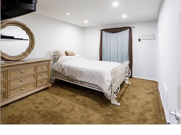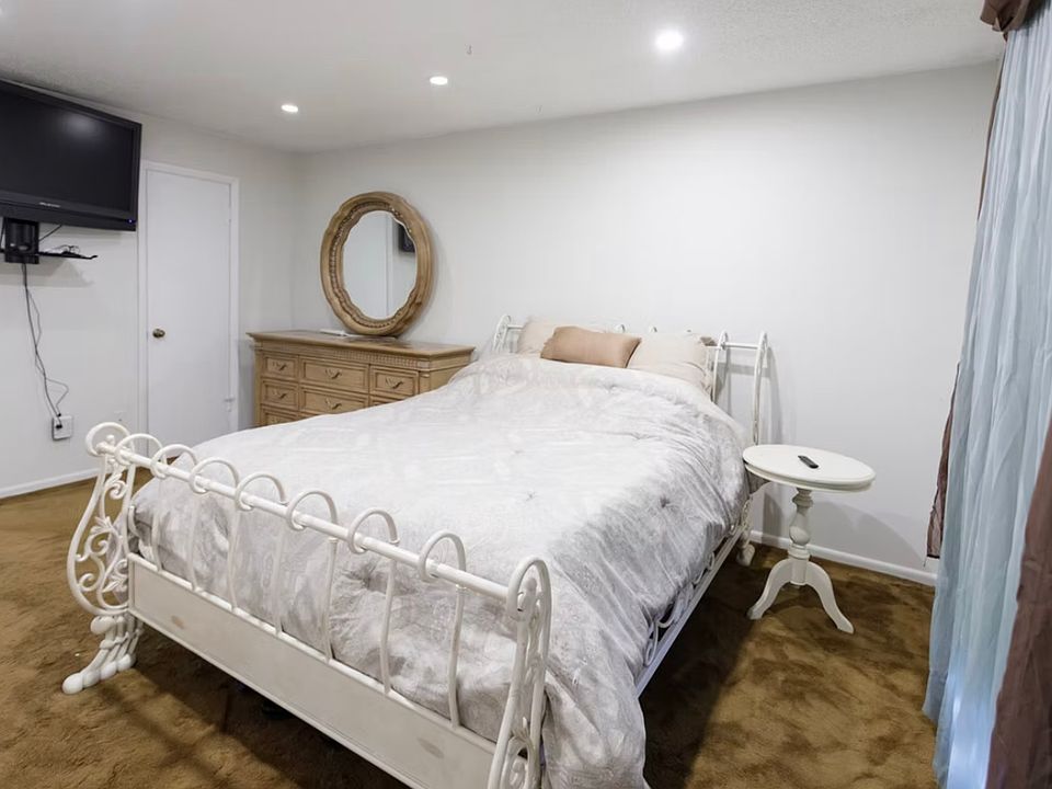 Furniture: Large dresser with mirror, walk-in closet with shelving and hamper, mounted TV, recessed lighting