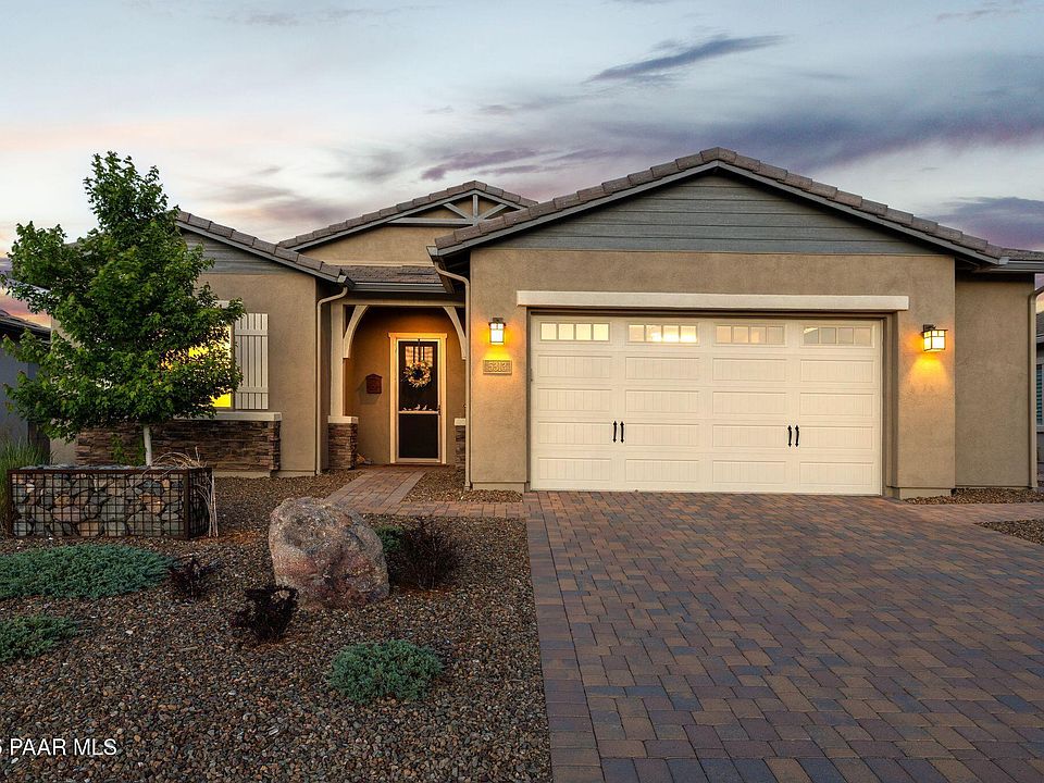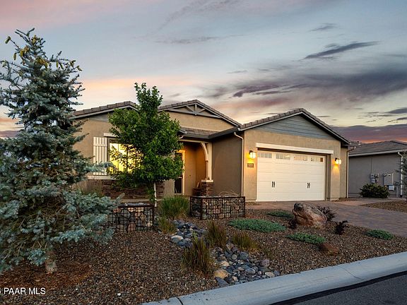 Beautiful move in ready one level home with panoramic views in the quaint upscale Walden Ranch Subdivision. This property gives a feeling of living out in the country with all the benefits of being close to businesses and services in historic Prescott. Expansive private views of the Granite Dells, Mingus Mountain, San Francisco Peaks and Glassford Hill. This popular Dorn Home plan boasts 3 bedrooms, and 2 bathrooms with open concept living. Wonderful natural light throughout the home. Wood flooring in main living area with carpeted bedrooms and tile flooring in the bathrooms. Leather style granite and quartz countertops and soft close cabinetry throughout. Enjoy entertaining with the large kitchen island with seating, chef's kitchen with GE appliance suite, with pantry. Under and over cabinet lighting in the kitchen and custom tile backsplash. Private primary suite with walk-in shower and walk in closet. The full guest bath is conveniently located adjacent to the guest bedroom. Spacious laundry room with storage, oversized 3 car tandem garage w/ bumpout, water softener and owned solar. A fenced backyard with covered patio, lighted water feature, custom landscaping and raised paver sitting area with gas fire pit. Just steps from the Walden Ranch community park.