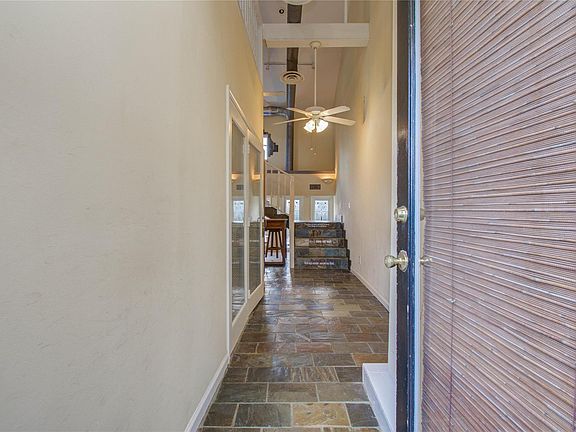 A remarkably unique two-bedroom, two-bath treehouse located in the heart of the Bellaire and Gulfton area. It is part of a close-knit community of unique homes. This particular treehouse boasts a private walkway leading up to a fenced-in front entry. As you ascend the wooden stairs, you'll find a remarkable 2-story layout with slate flooring throughout. The first floor includes a bedroom with an en-suite bath, and a cozy kitchen area with in-house laundry, while the upstairs features a bedroom/loft with a closet and walk-in closet. The location offers easy access to shopping, dining, entertainment, and major freeways. Walkable to parks and restaurants. Additionally, all appliances are included, and there is an option for one covered parking space available for $100 per month.