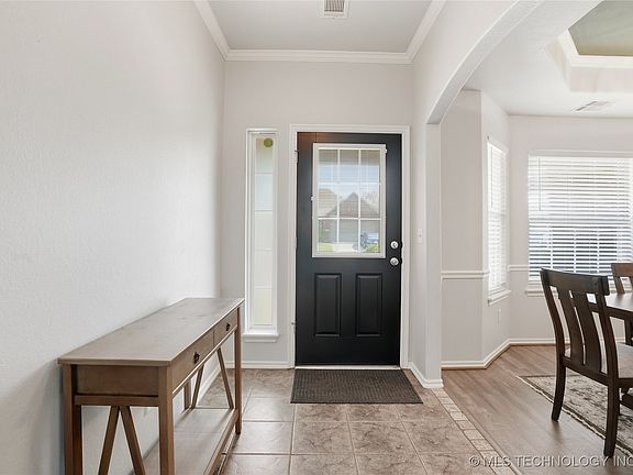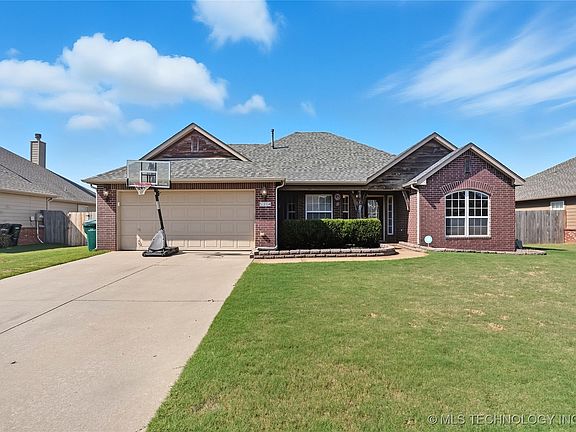 Beautifully updated 3-bed, 2-bath home offering an open layout, tall ceilings, and a cozy gas fireplace. Fresh paint and new flooring create a bright, move-in-ready feel. The spacious game room adds a second living area perfect for entertaining, while the detached insulated office shed with power is ideal for remote work, hobbies, or extra storage. The primary suite features a large walk-in closet, double vanity, soaking tub, and separate shower. Located in a quiet, established neighborhood just minutes from downtown Sand Springs, Tulsa Hills, and downtown Tulsa. Includes safe room and 2-car garage!