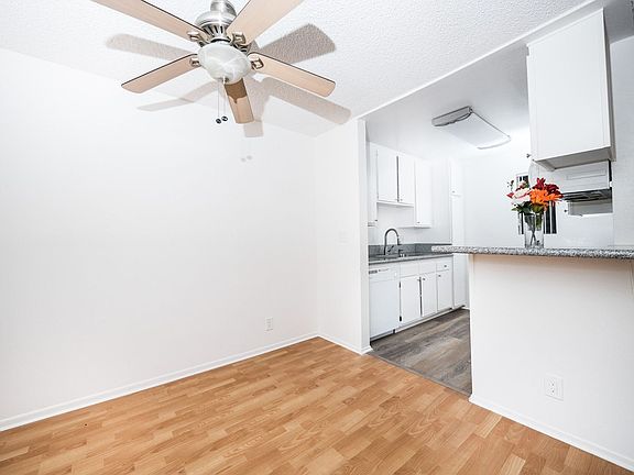 The spacious living room features wood floors, fresh paint, central A/C, and a large sliding glass door with vertical blinds that opens to your private patio. The dining area includes wood floors, a ceiling fan with light fixture, and a window with new wooden horizontal blinds.