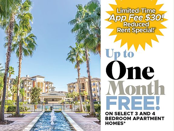 - Special offer! Up to One Month FREE on Select 3 and 4 Bedroom Apartment Homes!* For a Limited Time, App Fee is only $30* *May be subject to being split over three(3) full months of residency. Must apply and be approved by 12/5/25. Income restrictions apply, contact leasing office for details.