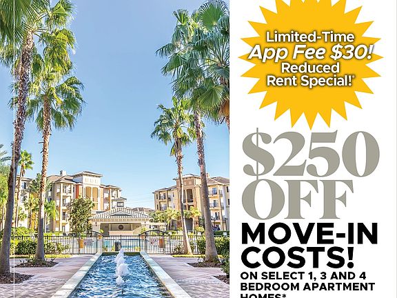 - Special offer! $250 OFF Move-In Costs on Select 1, 3 and 4 Bedroom Apartment Homes!* For a Limited Time, App Fee is only $30!* *Must move in by 11/14/25. Restrictions apply, contact leasing office for details.