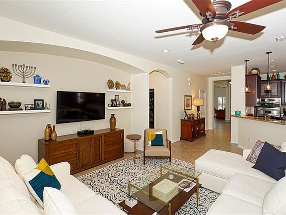 - Ceiling Fans(s), High Ceiling(s), Master Bedroom Downstairs, Open Floorplan, Stone Counters, Walk-In Closet(s), Solid Wood Cabinets, Living Room/Dining Room Combo, Window Treatments