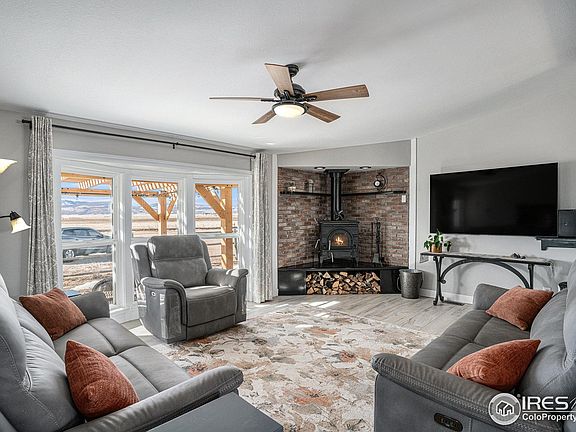 MOTIVATED SELLER This craftsman remodeled 3 bedroom and 2 bathroom home sits on a expansive property of over 2.5 acres, offering unobstructed views of the Colorado Rockies. The property includes two fenced areas ideal for livestock or horses, complemented by a 36'x13' three-stall loafing shed and a substantial 38'x28' heated and finished garage/shop. Access the home via a circular driveway where you can also park an RV with electric and water hookups available. Located at the end of the street with no covenants, this home is conveniently just 20 minutes from Old Town Fort Collins and 15 minutes from downtown Wellington. This move-in ready home features an open-concept, custom-designed kitchen with a farmhouse sink and a huge custom island providing additional storage. Black stainless-steel appliances enhance the space, set off by quartz countertops and custom light fixtures. Adjacent to the kitchen, a mudroom houses the washer and dryer for convenience. The open living area boasts wide ceramic tile flooring and is warmed by a wood-burning stove, with large windows framing the stunning outdoor vistas. The home's bathrooms have been newly remodeled, showcasing custom tilework and an antique restored vanity. The primary bedroom is a retreat with its large en-suite bathroom, which includes a soaking tub and a walk-in tiled shower. Outdoor living is equally inviting with a concrete patio featuring a pergola for enjoying sunsets, and a back deck with a pool to escape the summer heat.