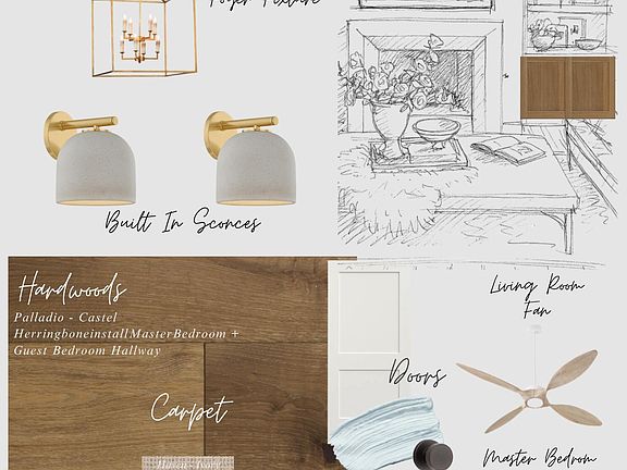Gas log fireplaceOffice spaceExposed ceiling beamsCoastal inspired mantelLarge covered rear porchArchways and moldingsWalk-in shower