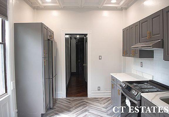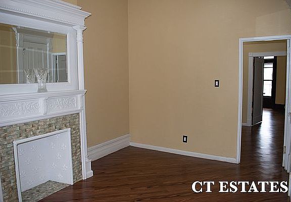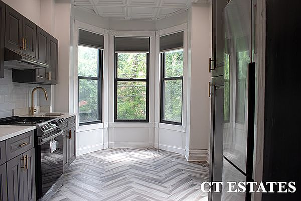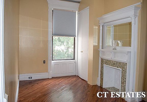 This gorgeous property has some of the architectural bells and whistles you've come to Bedford Stuyvesant to acquire with treasure trove of interior detail that is foretold in the entryway's oak pier mirror with built-in bench, arched frame with fretwork. Pocket doors leads you through the hallway with built-in cabinets and closets on one end that leads you into the charming eat in kitchen. That is bathed in sunlight with coffered ceilings, stainless appliances, granite countertops and grey cabinetry. The decorative fireplace is easily the centerpiece of the living room. Just off the living room is a second room (best as a guest room or office). The large bedroom is located at the front of the apartment with original oak pier mirror another set of pocket doors oversized windows with window shutter receives excellent northern sunlight exposure that creates a bright and welcoming space A short stroll to the A & C train at the Utica Ave station. No Pets.