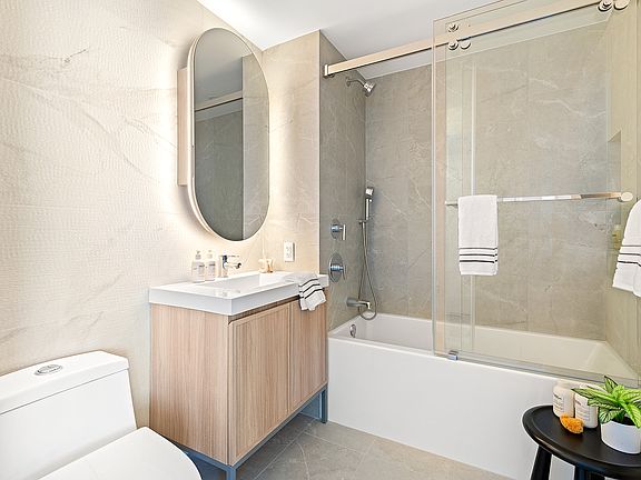 Discover elevated living at Sky Three Residences, where modern design meets coastal serenity in the heart of Southern Brooklyn. This spacious one-bedroom home features oversized triple-glazed windows that flood the space with natural light and frame stunning views of the Verrazzano Bridge or the beautifully landscaped outdoor amenity courtyard.