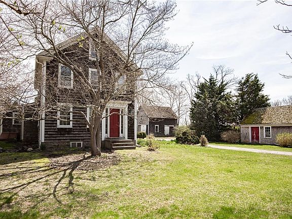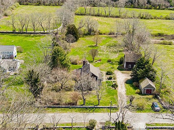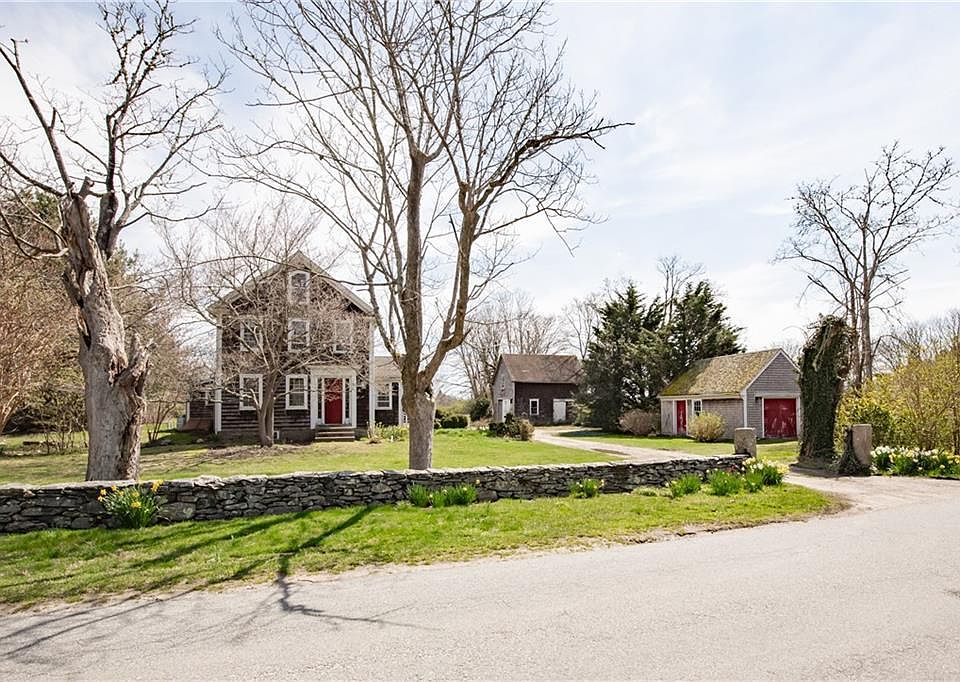 On a peaceful, quiet and sun drenched 1.24 acres, fronted with a quintessential New England fieldstone wall, sits this historic farmhouse built in 1870, a 1950's barn with loft, and a free standing garage/studio built in 2002. Rich with history, and also a 2002 addition, the farmhouse has three bedrooms, two full baths and one half bath. The open kitchen, with a brick fireplace, has two sets of double doors that open to both a newly rebuilt deck and a wrap-around covered porch which shares it’s railing with wisteria. The first floor also holds a large living /dining area and a separate study. The back of the expansive property faces east and the opportunities for gardens are endless. The second floor has three rooms and two bathrooms, and the third floor, while it is not heated, is finished and could eventually be a bedroom, studio, office…you name it! Just a mile from the galleries, shops and gourmet food at Tiverton Four Corners in one direction, and a mile from the very special Fogland Beach in the other, the highly coveted Puncatest Neck Road address, often referred to as Neck Road, is on the peninsula between Nonquit Pond and the Sakonnet River. The exterior of the farmhouse undoubtedly needs some immediate work. The Seller has never occupied the house, this is an estate sale and being sold as-is.