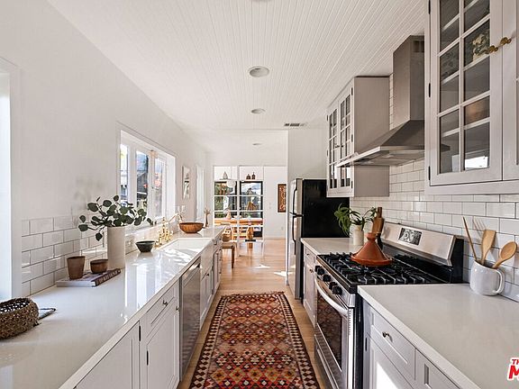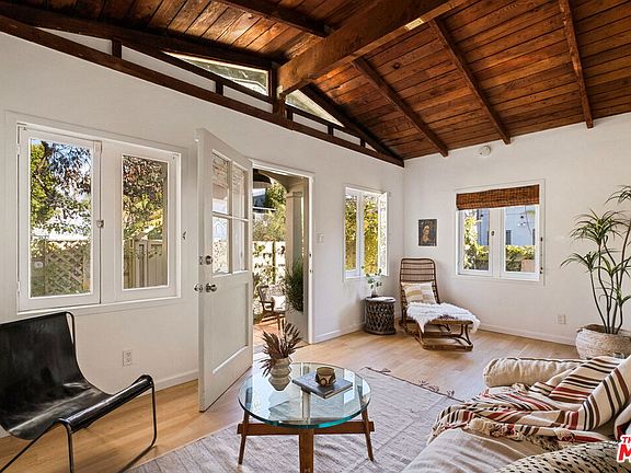 This exquisitely reimagined 1923 bungalow combines Venice charm with contemporary sophistication, moments from Abbot Kinney. The front courtyard, tucked behind a privacy fence and shaded by a eucalyptus tree, offers a warm and inviting welcome to the home. Stepping inside, the living room captivates with its vaulted beamed ceiling, central fireplace, and large windows that bathe the space in natural light. Rich hardwood floors enhance the timeless character of the home. The galley-style kitchen, featuring a classic subway tile backsplash and brass fixtures, seamlessly connects to an adjacent dining area. French doors from the dining space open to a serene patio framed by vibrant bougainvillea and lush ficus, creating an ideal setting for outdoor relaxation. The main level is complete with two tastefully appointed bedrooms, a vintage-inspired bathroom, and a convenient laundry closet. Upstairs, the sunlit primary suite is a tranquil sanctuary, boasting soaring ceilings, abundant storage, and a spa-like bathroom with a custom dual vanity and intricate mosaic tilework. A private patio leads to a stunning rooftop deck with panoramic views, perfect for entertaining or unwinding. Situated just moments from the beach, Abbot Kinney, and the best of Venice, this exceptional home effortlessly blends style, comfort, and an unbeatable location.