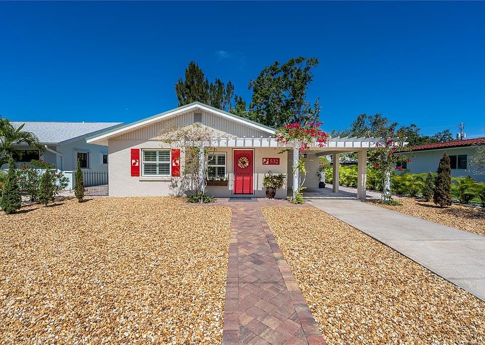 Welcome home to your own piece of paradise in this charming Island Home. This adorable, nicely renovated home has 2 bedrooms, 1.5 baths, office area, laundry room, and huge screen enclosed lanai. Large kitchen with granite counters, glass tile back splash, newer stainless steel appliances, plantation shutters, engineered hardwood floors and ceramic tile throughout this open concept kitchen/living/dining room home. Brand new Raised Seam Metal Roof, all new inpact resistant windows and doors, new paver walkway, re plumbed entire house interior piping system, new hot water heater, remodeled half bath and office area. Situated on a quiet street nestled on an over sized lot with a spacious screened patio area perfect for entertaining, an outdoor paver patio with a pergola, and a hidden oasis in the trees perfect for relaxing .Fenced-in back yard with ornamental steel fence. This home is designed with a modern eye, but still maintains that old Florida charm. Conveniently located to downtown. Bike or golf cart to Venice Main street and all of the shops and restaurants or even the beautiful Venice Beach. Don't miss this opportunity to call this place HOME!