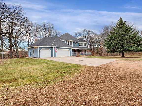 Beautiful 1991 custom built home located on over 30 acres. The sprawling 2-story home has features throughout beginning with a welcoming wrap around front porch and large entry. Greet your guest into this stately home with a large living room with fireplace in the front, wrapping around to a formal dining room, large, updated kitchen, dinette, huge family room w/fireplace and 3-season porch, a main level office is also on the main level. The upper level boasts a gorgeous master suite with a wall of windows, walk-in closet, private full bath with sep tub/shower. Three additional BRs are located on the upper level along with a loft and full bath w/tiled shower and 2 bowl vanity. The lower level features a huge amusement room w/fireplace, additional room for workout space/office, laundry and storage. A 72x30 barn with partial concrete floor is a huge bonus! This is a fantastic opportunity for tons of privacy.