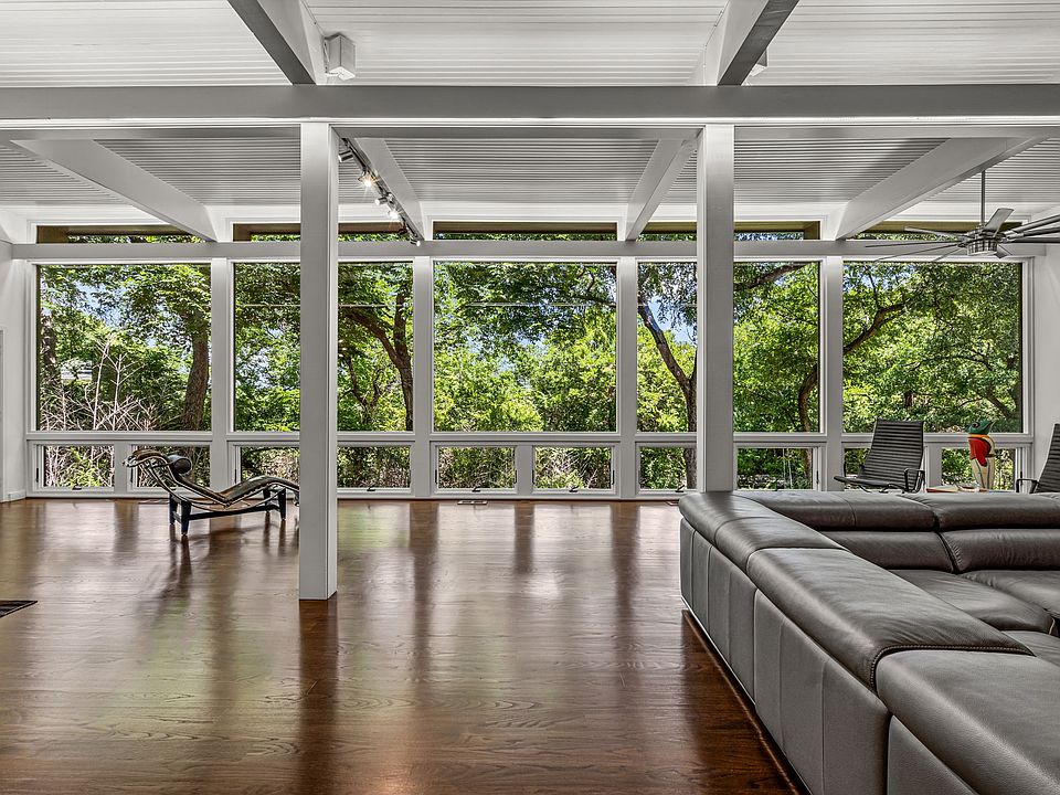 This stunning mid-century modern tree house, nestled on a private cul-de-sac and designed by locally renowned architect Albert Komatsu, boasts unique stone accents, a grand fireplace, warm hardwood flooring, and walls of windows that bathe the home in natural light. The large rooms are perfect for entertaining, and the sleek kitchen is a chef's dream, equipped with two Sub Zero refrigerators and freezers, two dishwashers, and a Dacor dual-fuel range, plus a separate convection oven and built-in microwave. Primary suite offers wall of windows, electric black out shades, and en suite bathroom with Kohler Centennial claw foot bath and original mosaic tile. Up the iron, cantilevered stairs are two additional bedrooms and one bathroom. Located on a generous lot at almost an acre. Serene, private, convenient. Moments away from River Crest Country Club, Shady Oaks Country Club, fabulous dining and easy access to downtown, Quail Run is a truly unique address.