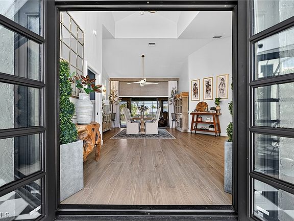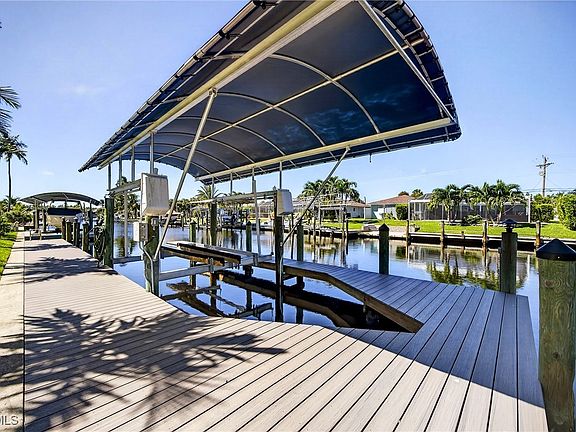 ONE-OF-A-KIND IN CAPE CORAL! SIMPLY STUNNING 3 BEDROOM, 3 BATH, 2-CAR GARAGE WATERFRONT POOL HOME WITH QUICK ACCESS TO THE CALOOSAHATCHEE RIVER LEADING TO THE GULF! NO FLOOD DAMAGE OR FLOOD CLAIM FROM HURRICANE IAN. 80’ of waterfrontage with 60’ Trek dock, water, electric and 7,500 lb. boat lift for the avid boater. Professionally decorated with high end accents and rich architectural details captured in every room of this amazing home! Beautiful iron doors lead inside to an open floor plan featuring high ceilings, contemporary décor, modern lighting, imported Italian tile floors, separate office with glass door entrance and light and bright living and dining space exuding coastal luxury. Gourmet chef’s kitchen offers leathered quartz counters, custom cabinetry, stainless appliances, breakfast bar and barn doors leading to separate coffee bar. Designer primary suite is a haven for relaxation featuring access to lanai and luxurious en-suite. Split floor plan gives plenty of privacy for guests featuring inviting bedrooms and separate updated guest bath with custom tiled walk-in shower. Large inside utility room features high end washer and dryer and extra space for storage. Step outside to an exceptional entertaining area featuring covered lanai with custom ceiling and accents making this a comfortable space for entertaining, nighttime exterior lighting, convenient pool bath and screened heated deep pool overlooking outside patio and paver walkway to dock. Northwest exposure to enjoy gorgeous sunsets. Hurricane impact windows, iron front door, StormSmart screens and new roof in 2022 provide ultimate peace of mind. New lush landscaping, extended paver driveway and walkways plus soffit and exterior lighting add to the enhanced curb appeal. Not one detail has been overlooked in this truly impressive home. Great location minutes from Tarpon Point Marina and downtown Cape Coral with fine dining and shopping, fishing, boating plus close to great schools and a short drive to Fort Myers and gulf coast beaches. This home is truly a masterpiece! Don’t miss this opportunity! Schedule your private showing today! See attached for extensive list of seller upgrades and features.