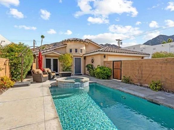 Would you like to live in one of the most unique architecturally styled homes in La Quinta Cove? This one of a kind custom built timeless Spanish style home with your own turret has lofty ceilings, crown molding, and bell curve archways throughout the home. Designed with a spacious open concept floor plan, this home has three ample sized bedrooms to include a large master bedroom en-suite and walk-in closet, bright private home office with french doors off the living room and sliding doors to the back yard, with 2 bathrooms. The private heated salt water pebble tech finish pool & spa has spectacular panoramic mountain views. Imagine sitting by the pool surrounded by nature and breathtaking views. This property is located in walking distance to Old Town La Quinta shops & restaurants, hiking & biking trails. You are also close to festivals, polo grounds, golf courses, parks, art district and more. This is your chance to live in paradise!