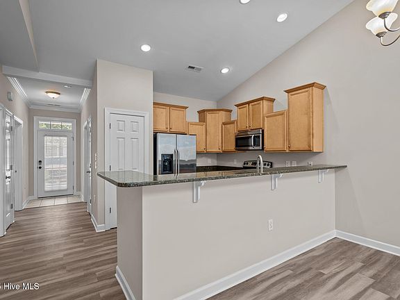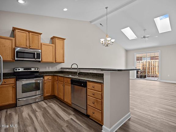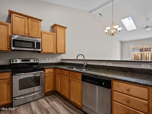 Welcome to this beautifully maintained, move-in ready townhome located in Carleton Place, featuring attractive, new LVP flooring and a fresh, neutral color palette throughout. Enjoy an open and airy layout with vaulted ceilings that enhance the spacious feel of the main living area. The kitchen is complete with stainless steel appliances, granite countertops, stylish cabinetry, raised bar seating, and a convenient pantry. The adjoining dining area flows seamlessly into the living room, where skylights fill the space with natural light and sliding glass doors open to a private, fenced backyard with a patio—perfect for grilling, relaxing, or gardening. The primary suite offers a peaceful retreat with a walk-in closet and an ensuite bath featuring a dual-sink vanity. Two additional bedrooms and a guest bathroom provide ample space for family or visitors, while a laundry closet conveniently located off the kitchen adds to the home's practicality. This low-maintenance property allows you to enjoy all that Carleton Place has to offer, including a sparkling outdoor pool and clubhouse. Ideally situated just minutes from UNCW and only a 15-minute drive to Wrightsville Beach or downtown Wilmington, this townhome offers the perfect blend of comfort, convenience, and coastal living.