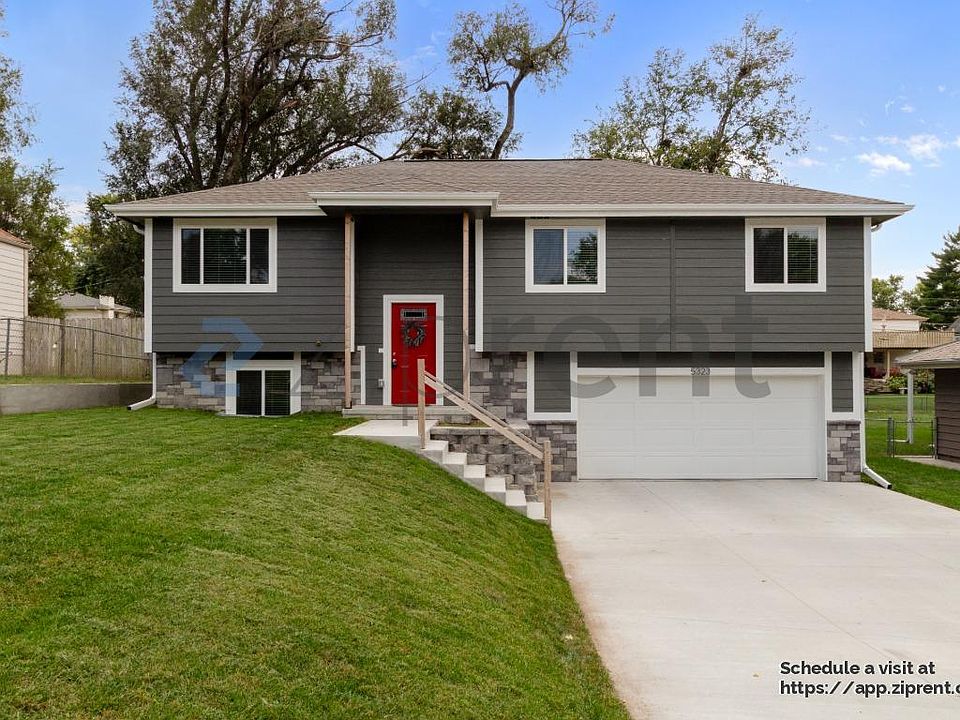 Welcome to 5323 P St, Omaha, NE 68117 a beautifully updated split-level home offering modern living with a touch of charm. This residence greets you with its striking exterior, featuring a bold red front door and a combination of gray siding and stone accents. The expansive front yard and driveway provide ample parking and a welcoming first impression. Step inside to discover a thoughtfully designed interior, where natural light floods the open-concept living and dining areas. The kitchen boasts rich wooden cabinetry, stainless steel appliances, and a stylish island with pendant lighting, making it perfect for both everyday meals and entertaining guests.