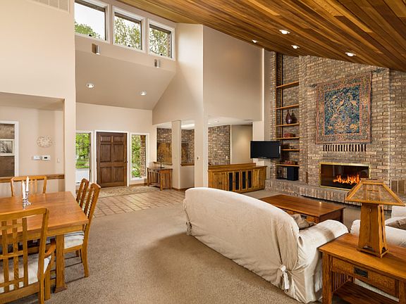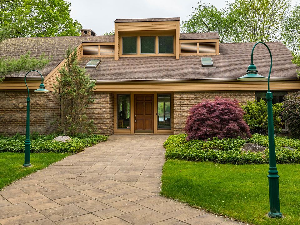 Uniquely designed this 80's all brick contemporary ranch is a one of a kind. Only 20 minutes from GR it is a personal retreat for the person looking for acreage, waterfront, convenience & solitude on a private lake. Round Lake frontage (267 feet) for swimming, kayaking, fishing (90'deep), &/ or hunting on 10 acres. Main living area has vaulted wood ceiling, raised brick gas fireplace, heated floors, slider & decking w full length windows along the rear to view the lake. Chef's kitchen w Quartz counter tops, high end stainless steel appliances, convection oven, induction stove, trapezoid windows & skylights. Cedar Closets are throughout the home. Living is made convenient w a 2nd kitchen on the walk out level, a steam shower, standby generator & driveway alert & reverse osmosis