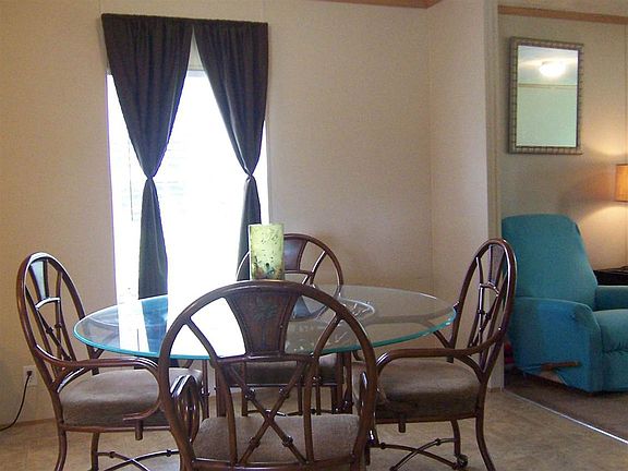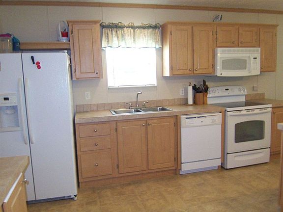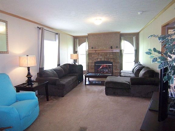 3 bedroom 2 bath mobile home built with an open floor plan and a split bedroom plan. There is a living room & a family room; the family room features a fireplace. The kitchen is spacious & has an island with breakfast bar. The master bath is large & has a separate shower & a soaking tub. The flooring is carpet & vinyl. The back yard is large. The storage building & swing set remain.