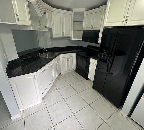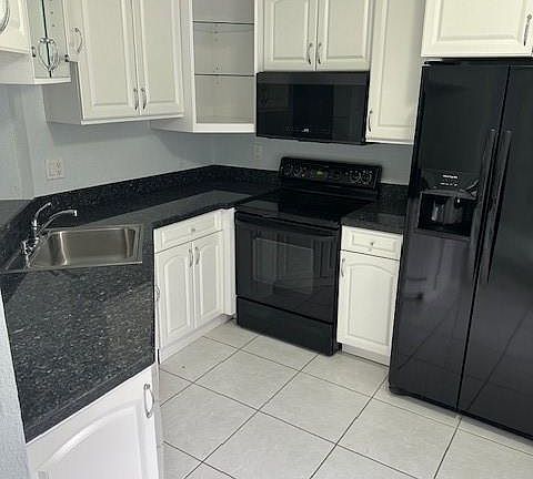 This charming home features tile flooring throughout the main living areas for easy maintenance and a modern feel, while the bedrooms are adorned with wood-look laminate flooring for a warm and cozy touch. The kitchen offers a clean, contemporary look with crisp white cabinetry, striking black granite countertops, and sleek black appliances perfect for home cooks and entertainers alike.