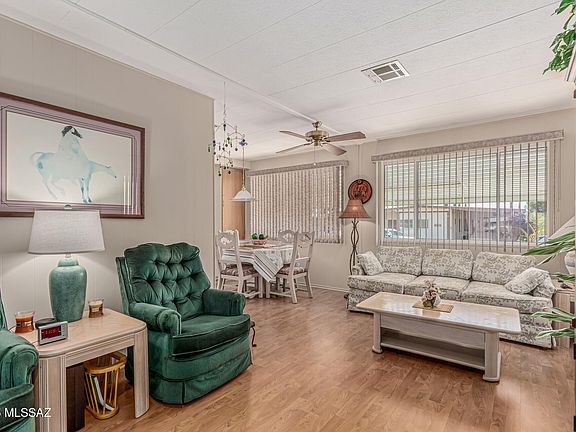 This 2 bedroom/2bath mobile home is immaculate and incredibly well maintained located in Tucson Estates 55+ community where you can enjoy unlimited golf, tennis, pickleball, shuffleboard, pool, spa, exercise room, trash collection & much more. Newer AC, Hot water heater, newly painted inside and out. There are an abundance of ''Clubs'' that appeal to every interest you can imagine to keep yourself busy or just enjoy the peace and quiet with serene mountain views this community has to offer. This is truly one of Tucson best kept secrets, where ''having it all'' comes together in one beautiful community. Pack your bags and move on in, as just about everything in the home can be purchased on a separate bill of sale. Come see for yourself!!! Buyer to verify sq ft.