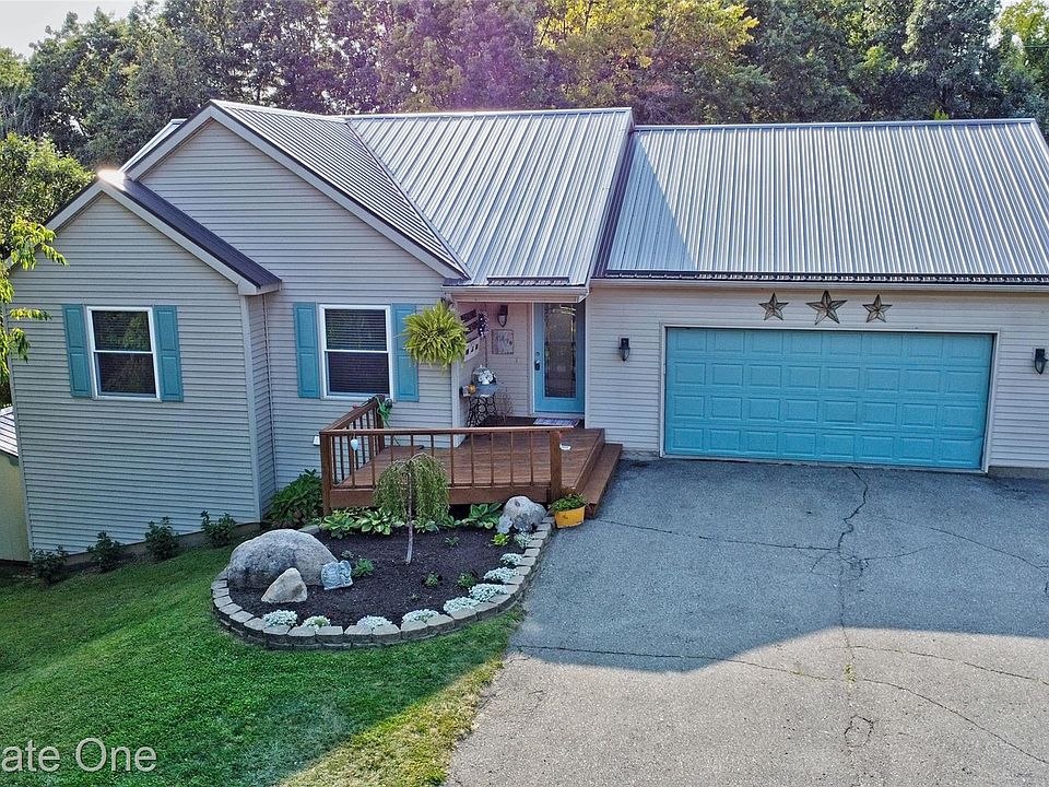 *****OFFER DEADLINE FOR FRIDAY 9-12-25 AT NOON******Set on 1.5 wooded acres, this meticulously maintained ranch offers a perfect blend of updates, space, and privacy. The beautifully remodeled kitchen (2023) features soft-close shaker cabinetry, stainless steel appliances, pull out shelves, a farmhouse sink, touchless faucet, and neutral wood laminate flooring that flows throughout the main level. The cozy family room opens to a covered deck—ideal for quiet fall evenings overlooking your private slice of nature. The main level also includes a convenient first-floor laundry and updated bathrooms with granite counters, tile showers, and glass doors. The finished walkout basement expands your living space with a family room, kitchen perfect for family gatherings, bedroom, full bath, and two doorwalls that flood the space with natural light—perfect for guests or multi-generational living. Outside, enjoy a spacious backyard with a storage shed, metal roof, Hansen's Triple Paned windows with transferable warranty, bonfire pit, and plenty of extra parking for visitors, a camper, or a utility trailer. A 2-car attached garage completes the package.