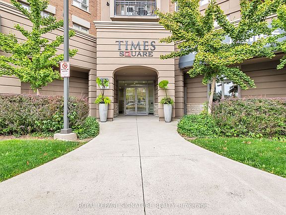 Welcome to this stunning top-floor 1-bedroom, 1-bathroom condo in the highly sought-after Orchard community's Times Square Condos, offering 619 square feet of thoughtfully designed living space with soaring 10-foot ceilings. The bright, open-concept main living area features beautiful hardwood flooring and seamless flow between living, kitchen, and dining spaces. Directly off the living room, French doors with upgraded pet-friendly mesh screening lead to your spacious 44-square-foot balcony. The gorgeous kitchen showcases extended-height dark wood cabinetry, sleek granite countertops, ceramic tile flooring, stainless steel appliances, including a new bottom-freezer fridge, potlights, and a double sink with a sprayer feature. The generously sized bedroom features plush carpet, a large walk-in closet with custom shelving, a ceiling fan with light, and direct access to your spacious ensuite bathroom with ceramic tiles, upgraded lighting, a luxurious dual-head shower system, and a convenient full-size front-load washer and dryer. This unit includes prime parking in P1 beside the elevator, plus a large storage locker. Located minutes from the QEW, top-rated schools, shopping, and Bronte Creek Provincial Park. Don't miss this opportunity book your private showing today!