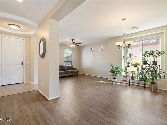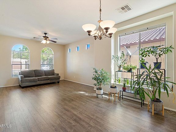 Welcome to this spacious single-level home featuring an open floor plan and tons of natural light throughout. The kitchen boasts upgraded LG stainless steel appliances, abundant cabinet space, a large center island with breakfast bar, and recessed lighting—perfect for everyday living or entertaining. The inviting living area offers neutral tones, wood-look flooring, and large windows that frame the outdoor views beautifully. Step outside to your private backyard retreat, complete with a sparkling pool, mature palms, and a recently seeded lawn for lush winter grass. Enjoy year-round comfort with a new Trane A/C unit installed in 2022. This home combines modern updates with timeless comfort—ready for you to move in and make it your own!