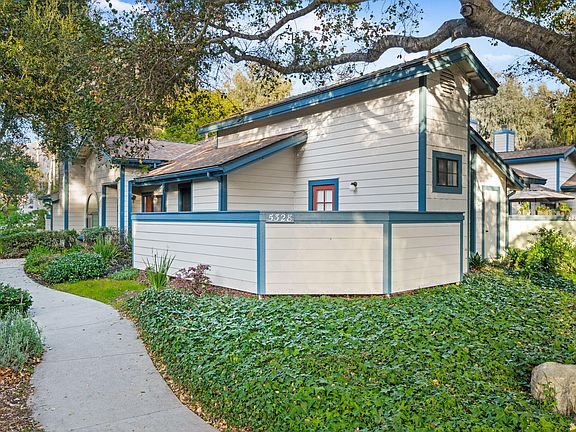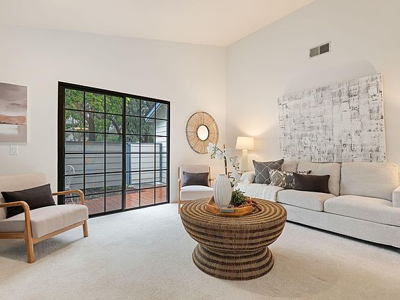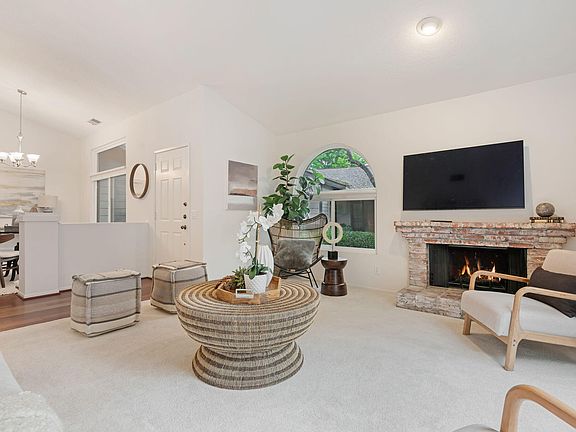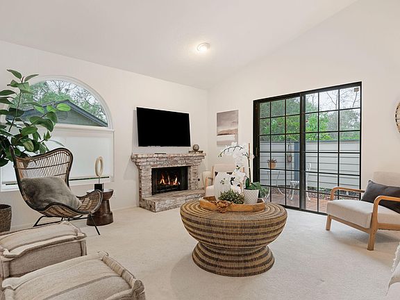 Serene single-level living in Sunrise Village. Tucked away at the back of the development and surrounded by mature trees, this inviting single level 2-bedroom, 2-bathroom home offers privacy and a natural setting. Step inside to an open-concept living space with soaring cathedral ceilings, a cozy living room with a fireplace, and sliders leading to one of two private patios. The kitchen and dining area seamlessly connect to the living space, creating a comfortable and functional flow. The primary suite features an en-suite bath and its own private patio, while the second bedroom is perfect for guests, family, or a home office. A spacious hall bath completes the interior. Additional conveniences include an attached one-car garage with interior access and an assigned parking space. Sunrise Village offers fantastic amenities, including a community pool, tennis courts, a barbecue area, and a playground. Conveniently located near shopping, parks, and scenic walking trails this is a wonderful place to call home!