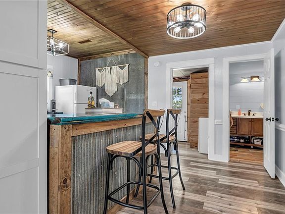 Charming, move-in ready bungalow featuring an inviting front porch. This spacious home is ideal for a small family, boasting an open floor plan with recent renovations. It showcases a stunning wood ceiling, a custom epoxy walnut island, and a pantry to meet all your storage needs. The bedroom includes a walk-in closet, and the bathroom offers a tiled walk-in shower. Upgrades include a new roof, siding, windows, quartz countertops, and fresh paint. Enjoy the large back deck for family barbecues and a fenced yard for pets, complete with a shed and a chicken coop.