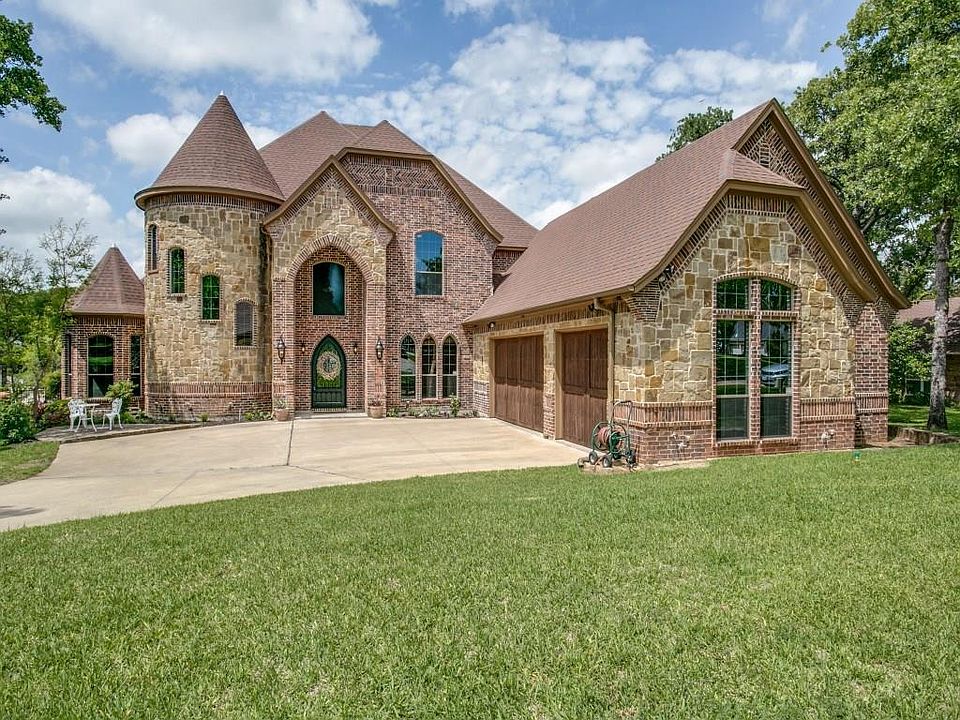 Luxurious lake front custom home! Amazing curb appeal with dramatic roof pitches, turret, stone accent, cedar garage doors & gothic arched door. Open concept design with large windows showcasing the beautiful views. Handscraped wood flooring, stacked crown molding & built-ins throughout. Gourmet kitchen with commercial grade range & vent. Master retreat has sitting area & separate walk-in closets. Master bath has jetted tub & dual head walk through shower. Bedrooms 2 & 3 are down share jack & jill bath. Winding staircase leads to large game room, media room & bed. New 16 SEER AC unit upstairs. New heated pool with spa & firepit. New boathouse with lifts. 7' stone ledge by waters edge to relax by the water.